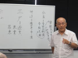 雨宮氏には、まず荒川の川筋の変遷、見沼代用水と綾瀬川の交差部分に造られた掛樋の話から、市内に多数残されている庚申塔の謂(いわ)れから市内に現存する庚申塔の案内まで、多数の資料を示しながら解説していただきました。洞派氏には、日常それと知らずに使っている仏教語の数々を紹介していただきました。いずれのお話もガイド時に役立つことばかりでしたが、私が両講師のように自然にさらりと説明できるようになるには、どれほどの長い勉強時間が掛かるものやら…と、冷や汗をかきながらの受講となりました。(ガイド会会員:関根 照之
