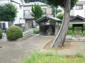 春日神社の1つ奥の道を入ると100m位行くと空き地になっている宅地に、庚申塔とともに風除けの屋根付きの堂の中に、脱衣婆の石像があります。