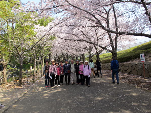 4月6日(水) 西保健センター・アッピーウオーキンの皆様(8名)に平方コースをご案内しました。当日は、快晴に恵まれ、先ず、多くの花見客が来ていた丸山公園の桜並木を散策、ちょうど桜も満開でとても喜んでいただきました。次に、小塚浅間塚・八枝神社・橘神社・馬蹄時へと、荒川縁の自然を楽しみながらご案内しました。(文・写真:杉山)