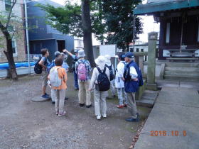 前日の暑さとは変わり、薄曇りの散歩日和の中、氷川鍬神社をスタートに、屋根の上の鐘馗様・本陣跡・脇本陣跡を説明しながら、中山道を愛宕神社まで話しながら歩きました。愛宕神社では、ケヤキの巨木の木陰で神社の変遷に耳を傾けられ、東町の片足の地名の話、二ツ宮氷川神社の見事な透かし彫りに感心されていました。