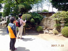 日差しはますます強くなり、ゲストは日傘をさし、どんぐり山の庚申塔、十連寺の庚申塔と巡りました。木陰を風が抜ける十連寺では、涼みながら名の謂れ、柴田七九郎の名の由来、朱印地拝領の寺院などガイドさせて頂きました。前回廻り残しの、川の大じめの庚申塔(道標・フセギの役割も担っている)、川の神明神社の庚申塔(大じめを綯う神社)、向山の神明神社の庚申塔(女人庚申塔)では綺麗に管理されている青面金剛像塔に刻まれた女性の名を見ながら、当時の女性の心意気に感心されていました。向山の庚申塔、向山の不動堂の浮彫の見事さにカメラのシャッターを押されていました。作者である宮大工の山田弥吉について、上尾、近在に作品が残されていることをガイドさせて頂きました。