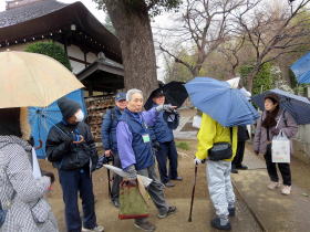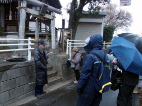 原市氷川神社では、メンバーによる歴史の有る、一間社流づくりの社殿を解説した。隣の長久寺では本尊の不動明王の解説と、墓地にある筆子塚を見て頂き、その云われを説明した。最後の原市大通りでは、矢部家の前で原市の三・八の市の歴史と上尾市指定樹木のハクモクレンを解説した。
