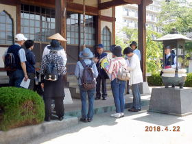 川の大じめでは、メンバーが地元ならではの細やかな説明を行いました。十連寺は同時刻に法事が入っておりましたので、門前にて、名前の由来等の軽妙な説明、そして住職の奥様が、四季折々、花を楽しめるようにと育てていたボタンが大きく咲き誇っていました。