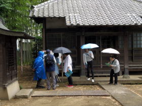 相頓寺では、ご住職の配慮により本堂に上げて頂き、相頓寺の歴史や文化財の分かりやすい解説を聞く事が出来た。本尊の木製延命地蔵や、内部の緞帳の見事な造りに、ゲストのみなさまも感嘆されていた。その後、雨の降る中、地蔵堂の相頓寺三仏や徳本行者供養塔等を説明した。