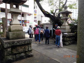 駅のコンコースを通り、春日神社に向かいました。春日神社の沿革や御祭神の紹介をし、石像のショウツカ婆さんでは三途の川の奪衣婆や閻魔大王・地蔵菩薩の関係に興味を示されていました。初めて聞いたとの声も聞かれました。柏座2丁目の庚申塔では庚申信仰と庚申塔の関係や、江戸時代の民俗信仰の様子に思いを馳せていました。谷津観音堂の十一面観音菩薩像・トテ馬車の事故と馬頭観音について紹介、約2時間の史跡巡りでした。ゲストの皆様は昼食後、ぐるっとくんバスで原市コースに向かわれました。