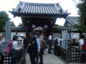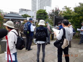 東口をスタートし、すずらん商店街を通り昭和30年代の商店街の様子を写真で紹介しました。遍照院では松本明慶仏師の十一面千手観世音大菩薩像と大不動明王像を身近にご覧になり、立派な仏像を鑑賞出来良かったと頷かれていました。孝女お玉の墓、山崎武平治碩茂の墓を紹介しました。