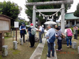 氷川鍬神社では上尾宿の概要や、神社の由来伝説の語りに絵馬の写真を見ながら、鍬の意味に頷かれていました。二賢堂碑記では上尾宿の人々の向学心と俳句を解する風流な人々に興味を示されていました。