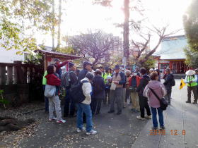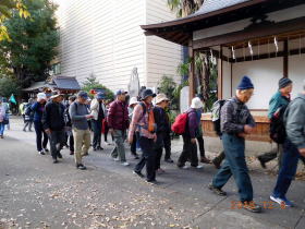 晴天の穏やかな天候の中、氷川鍬神社境内でゲストの皆様と合流しました。ゲストの皆様は三々五々、氷川鍬神社にお参りされてから、参集されワイヤレスイヤホンを通して上尾宿の特徴と概要について、分間延絵図を見ながら15分ほどガイドさせて頂きました。