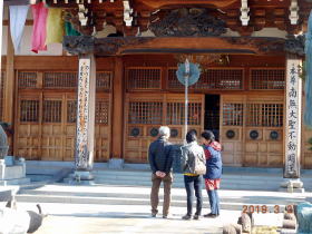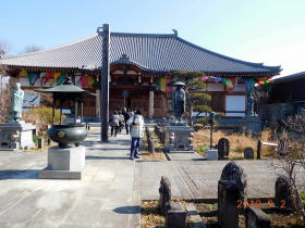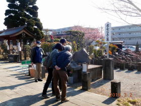 上尾宿の上寺・遍照院ではハイカーの皆様は本堂にお参りされ、紅梅や膨らみかけた『こぶしの蕾』のもと、遍照院の沿革、孝女お玉の墓、山崎武平治碩茂の墓などガイドの説明に足を止められていました。
