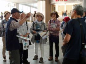 集合場所の上尾駅では、ガイド・サポートの紹介をして、上尾の呼び名、読み方、クレヨンしんちゃんの上尾ますみ先生、アッピーくん・まゆみちゃん・あゆみちゃんの話を説明し、興味を持って頂きました。