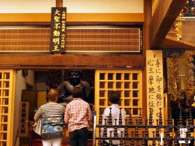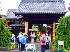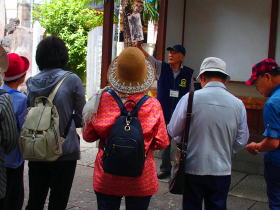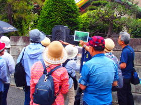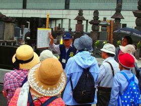 遍照院では、本堂に入れたので、不動明王・十一面千手観世音菩薩様を身近にゆっくりと観てもらい、喜んで頂きました。孝女お玉の墓、山崎武平治碩茂の墓、式守伊之助の墓、墓相の説明、境内の五基の庚申塔を足早に観て廻りました。