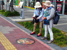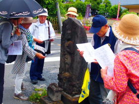 駅前の交差点付近でマンホール・カバーの説明し、西口にもあるので探して楽しんでくださいと。上の庚申塔では、庚申講の一般的説明をして、興味持ってもらいました。