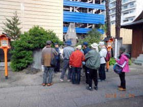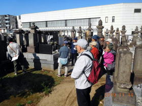遍照院では本殿の仏像を拝見させて頂き、不動明王像と十一面千手観音菩薩の大きさ、見事さに驚かれていました。山崎武平治碩茂、孝女お玉、三世式守伊之助の墓を紹介しました。「立派な仏像を見ることができました」との感想を頂きました。遍照院の庚申塔では多様な民俗信仰である庚申信仰・庚申塔について紹介しました。