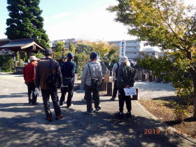 ふるさと校友会の皆様はガイド会を何度か利用されている団体です。上尾駅コンコースでガイド会メンバーの紹介、ツアー中の注意事項などお伝えし、晴天の穏やかな天候のもと、氷川鍬神社に向かいました。