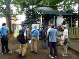 新たに参加された方が3割ほどいらっしゃいましたので、氷川鍬神社の境内で中山道上尾宿の概要、他を説明させて頂きました。