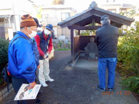 柏座2丁目の庚申塔では女性名のみ刻まれている女人庚申塔(市の指定文化財)で有る事を紹介しました。ショウズカの婆さん像では三途の川の怖い婆さんで亡者の衣服を剥ぎ、奪衣婆とも呼ばれていることを伝えました。ゲストの皆様は庚申塔・ショウズカの婆さんなど民俗信仰の多様さに興味を示されていました。また初めてショウズカの婆さんのことを知りましたと言われていました。