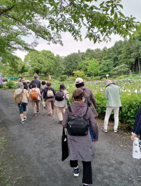 ゲストの皆様は、ぐるっとくんで9時半、自然学習館に到着。 資料配布と挨拶を済ませ、花しょうぶ園に。 皆様が楽しみにしていた菖蒲は満開の見頃。 大変喜んでいらっしゃいました。 平方の昔を思わせる町並み、八枝神社の巨樹・狛犬、橘神社の機雷等喜んでいただきました。