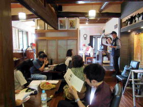その後、原市大通り山本屋ギャラリーに移動して、休憩をとりながら、原市町の歴史や原市藩について講座形式で説明会を行いました。また、山本屋では社長の星野氏にご挨拶をいただき、原市町や星野家について興味深いお話をしていただきました。