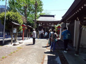 佐四郎稲荷で名前の由来・鳥居等について説明、宝蔵寺のボケ封じの白寿観音を参拝し、原市大通りで山本屋又右衛門商店・屋根の上の鐘馗様・矢部家等を散策しながら沼南駅に戻りました。