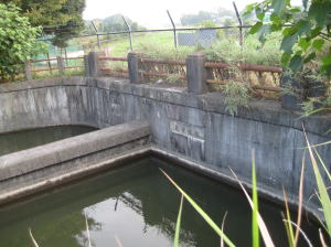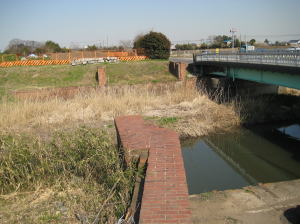 当地では綾瀬川と見沼代用水が交差しております。現在は見沼代用水が綾瀬川の下を潜り抜ける、つまり伏越の形になっていますが、こうなったのは昭和36年(1961のことです。それ以前は、綾瀬川の上に橋をかけて、その上を見沼代用水が流れるという正に川の立体交差だったのです。それを掛樋といいます。その掛樋が完成したのは、1728年(享保13年)のことです。当初は、長さ50m、幅7m、高さ2mの木製でした。しかし、木製のために損傷が多く、10年ごとに掛け替えが必要で、修理は毎年のように行われていたようです。そして、明治40年(1907)鉄製に造り替えられました。その時代の赤れんがの橋脚が今も残っております。そして、昭和36年(1961)掛樋