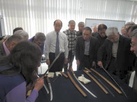 正しい鑑定を続けるには目線が大事、と強調されていました。日本刀ばかりではなく、ものごとを見るときに、目線を変えてみたり、他の人と一緒に見たりすると、今まで見えなかったものが見えてくることがある、とのことでした。多くの本物を見て、目を養っていくことが重要。遠山氏は、某所所蔵の国宝級の日本刀を数多く見て触ることで、鑑定眼を大きく向上させることができたのだそうです。日本刀を間近に見て、触らせて頂くことができ、ガイド知識の向上に大変役立った講演でした。(宮田記)