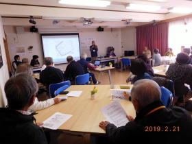 その後、宮田さんより大スクーリンに映像投影を行い、現在は殆ど痕跡が無くなっている室町時代初期の菅谷北城を地図図面から説明、土塁の跡が残る写真を示し説明が行なわれました。