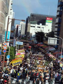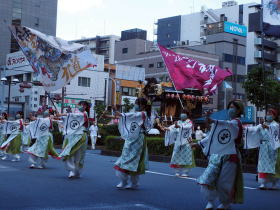7月16日には愛宕・仲町・上町・宮本町・柏座・谷津・本町・二ツ宮の各町内ごとに神輿の渡御が行われ、7月17日には中山道と上尾駅周辺の通りが交通規制になり、市内の上記8町内の神輿が勢揃いする「連合渡御」が行われました。当日は雲が多めながらお天気にも恵まれて、勇壮で華麗な神輿渡御と共に、山車の引き廻しが行われ、お囃子が祭り気分を盛り上げてくれました。また、よさこいソーラン踊り等のパフォーマンスも楽しめました。