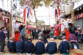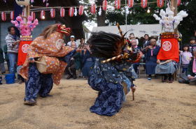 獅子舞は悪疫退散、風雨順調を願って奉納され、舞の伴奏に竹製のササラを用いるところから「ささら獅子舞」と呼ばれています。牝獅子を巡って中獅子と王獅子が争い、最後は互いに争いの無意味を悟って和解するという三頭で舞いです。岩槻城主、太田氏房のお抱え獅子と言われ、寛文年間から行われていたと伝えられ、今日では10月中旬の日曜日に諏訪神社境内と地区の檀那寺の徳星寺で執り行われています。埼玉県は獅子舞の宝庫で春は五穀豊穣、夏は家内安全、秋は収穫感謝を込め古くから県域全体で執行され神前で奉納する神事芸能であり人生の通過儀礼を伴うものであった。