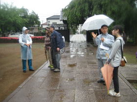 前日の大雨警報に引き続き、雨の降り続く梅雨空のもと、15kmのハイキングでした。「上尾駅からハイキング」は ”おもてなしの心” があふれている、との評価が高く、多くの方が雨の中ハイキングに参加していただきました。製茶会社や地元有志によりお茶や一口饅頭などが供されたり、また交通量の多い箇所にはコース案内係