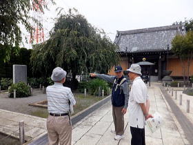 東京からお出でいただいた3名のお客様に原市地区をご案内致しました。 妙厳寺〜三角邸〜原市大通り〜相頓寺〜原市公民館(館内に展示されている模型「瓦葺掛樋」見学)をゆっくり廻りながら、ご説明致しました。 お客様には原市地区の昔の繁栄ぶりを想像いただきながら、原市の歴史・文化の一端に触れていただきました。(YM)