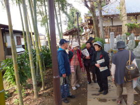 未明までの雨も上がって、おだやかな小春日和のなかのガイドとなり、一安心です。谷津観音堂では12年に1度のご開帳が昨年行われて、次回は2026年とのガイドの説明に、「それまで元気でいて、御本尊を拝まなくちゃ!」と気合が入りました。春日神社近くの「しょうつかの婆さん」(脱衣婆)の石仏では、「私が若いときはお堂はなくて、野ざらしだったよ」などと教えて頂き、さすが歴史散歩グループの方々だと感心した次第です。日乗院、昌福寺と和気あいあいでゆっくりと回り、昼前に無事ガイドを終了しました。 (宮田記)