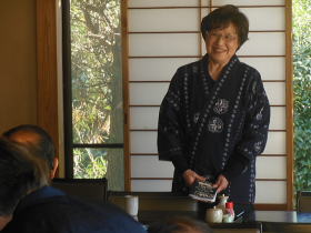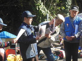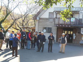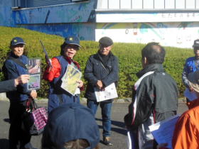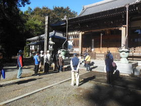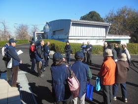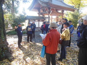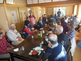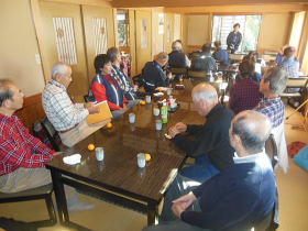 11月27日(金)、冬将軍到来!と言われた前日とは打って変って穏やかな天候の中、桶川市ガイドボランティアの会会員10名様に、大石コースをご案内しました。最初の丸山公園では四季折々に咲く花などを写真でご説明、次に徳星寺では大かやの木の根の大きさに驚いていました。「ハガキの木」の葉を拾って、この葉に切手を貼れば実際に投函できるとの話で大変盛り上がりました。榎本牧場では榎本社長がわかりやすく説明をしてくださいました。近くには「首切り場」という古い地名が残っているとの説明を聞き、戦国時代が身近に感じられました。隣接の殿山古墳からの出土品に、西日本で作られた2万年前のナイフ型石器があると写真を使った説明があり、ここに住んでいた縄文人と遠い西日本との交流に想いを馳せました。道々、女性陣は道端に設置してある無人販売所で、新鮮!安い!と言って農産物を購入していました。昼食後に、あげお語り部の会による民話をお楽しみいただきました。その後、アッピーガイド会の先輩格である桶川市ガイドボランティアの会(10名)と上尾ガイド会(9名)による交流会が行われ、相互交流を深めながら、いろいろアドバイスもいただき、有意義な時間を過ごしました。(記事:宮田、写真:小島)