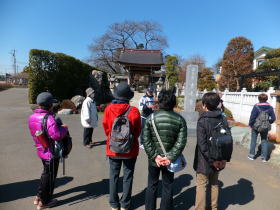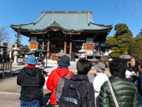3月2日(水)に、上尾市西保健センターアッピーウオーキングライフ終了者の会の7名の皆様に、駅西コースをご案内しました。2月3日に引き続き2回目のご用命で、ガイドも大張りきりでした。皆様でお話しをしながら移動して、たまたま西保健センター前を通りかかったとき、西保健センターのアッピーウオーキングライフ企画担当者とばったりお会いしました。「歩こう会」の講座が終了したあとも、ウオーキングを実践していることが確認でき、喜んでいらっしゃいました。昌福寺では、山門のすぐ内側に池を造る大工事をしていてので境内に入ることはあきらめて、山門前でガイドをしていたところ、工事監督者の特別のご配慮で境内に入ることができ無事にガイドができました。十連寺では、ちょうど見ごろの河津桜の前で記念写真です。